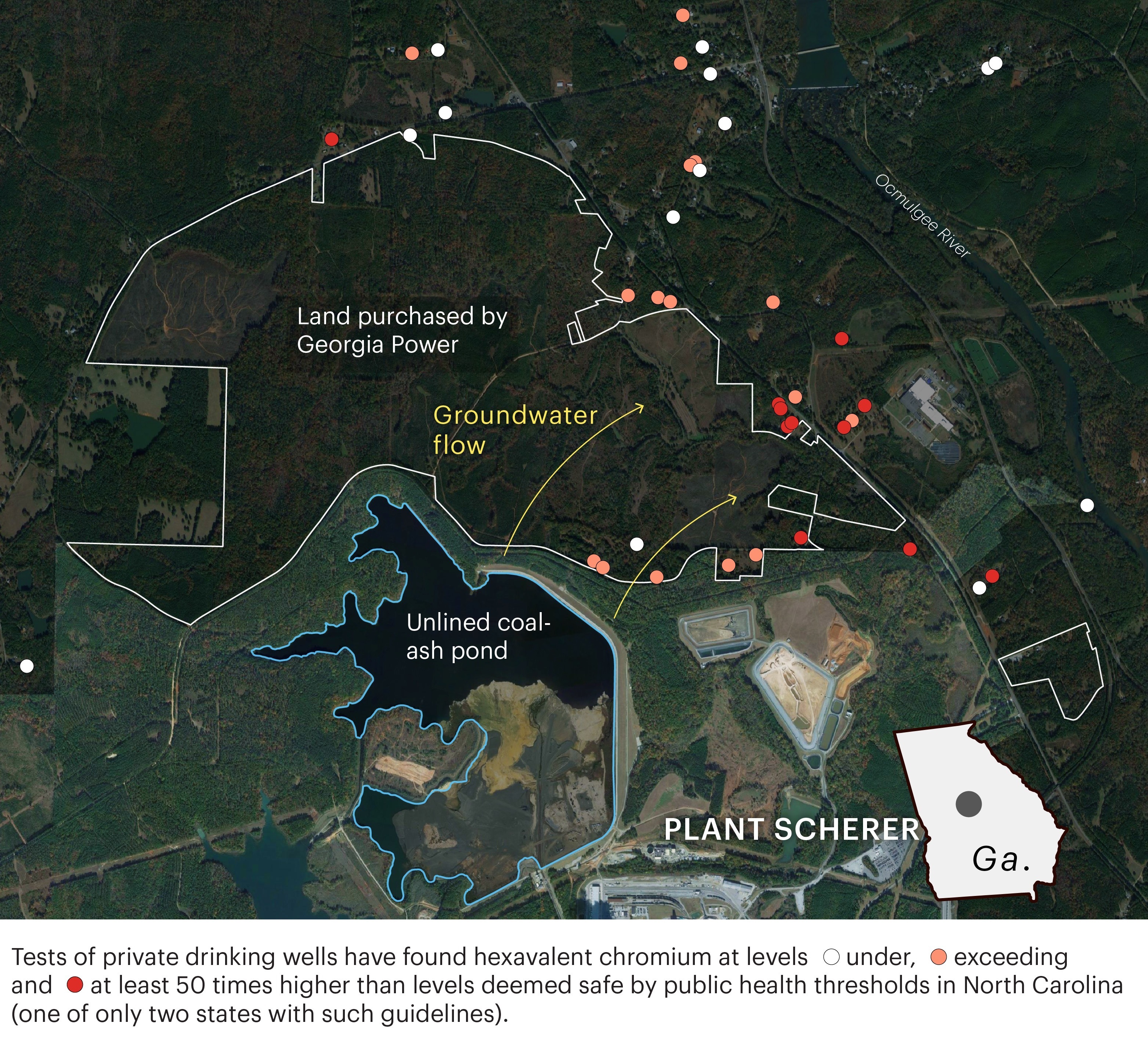Starting in 2016, the Altamaha Riverkeeper began testing private wells for contaminants commonly found in coal ash, including hexavalent chromium, a trace metal associated with an increased risk of cancer. That same year, Georgia Power went on a buying spree, acquiring properties near the plant and sealing those wells. The company denies that coal ash has sickened its neighbors, adding that hexavalent chromium is “naturally occurring.”