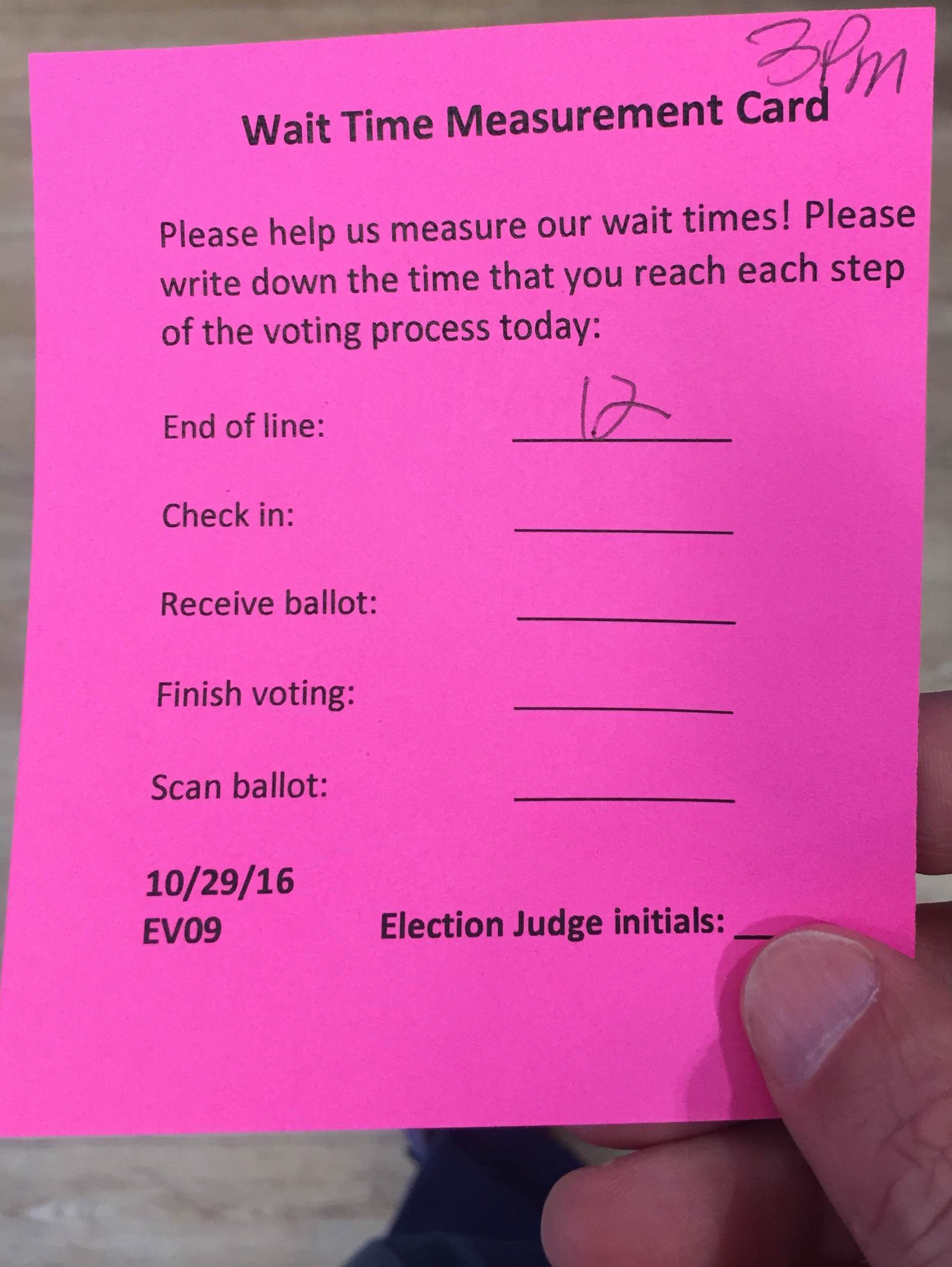 More than 400,000 people voted during Maryland’s first four days of early voting, according to data released by the state on Sunday. I was one of them, waiting a few minutes in line at the Wheaton Volunteer Rescue Squad station in Montgomery County, a suburb of Washington D.C. When I entered, a poll worker handed me the card pictured above, which is used to track how long voters might have to wait at early voting centers.