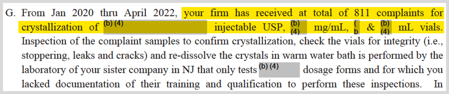 Crystals in testosterone vials are not unusual, and Sun and other manufacturers include instructions on the label to get rid of them by warming the product. FDA inspectors, however, went back to the factory in Halol in 2022 and found that Sun had received hundreds of complaints about the crystals, including two that noted it took more than five hours to dissolve them when it should normally only take minutes.