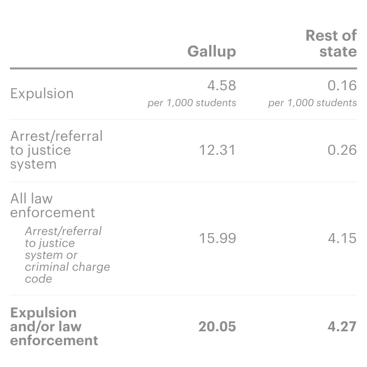 - To compare Gallup-McKinley and the rest of the state, we divided the district’s expulsion rate (4.58) by the sum of the rest of the state’s rates for expulsion and arrest/referral to the justice system (0.16 + 0.26)