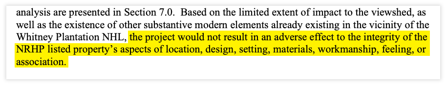 The determination of the historic district, the findings about the impact on Whitney and the community around it, and the lone sentence about unknown graves had all been removed. The report now concluded that “the project would not result in an adverse effect.”