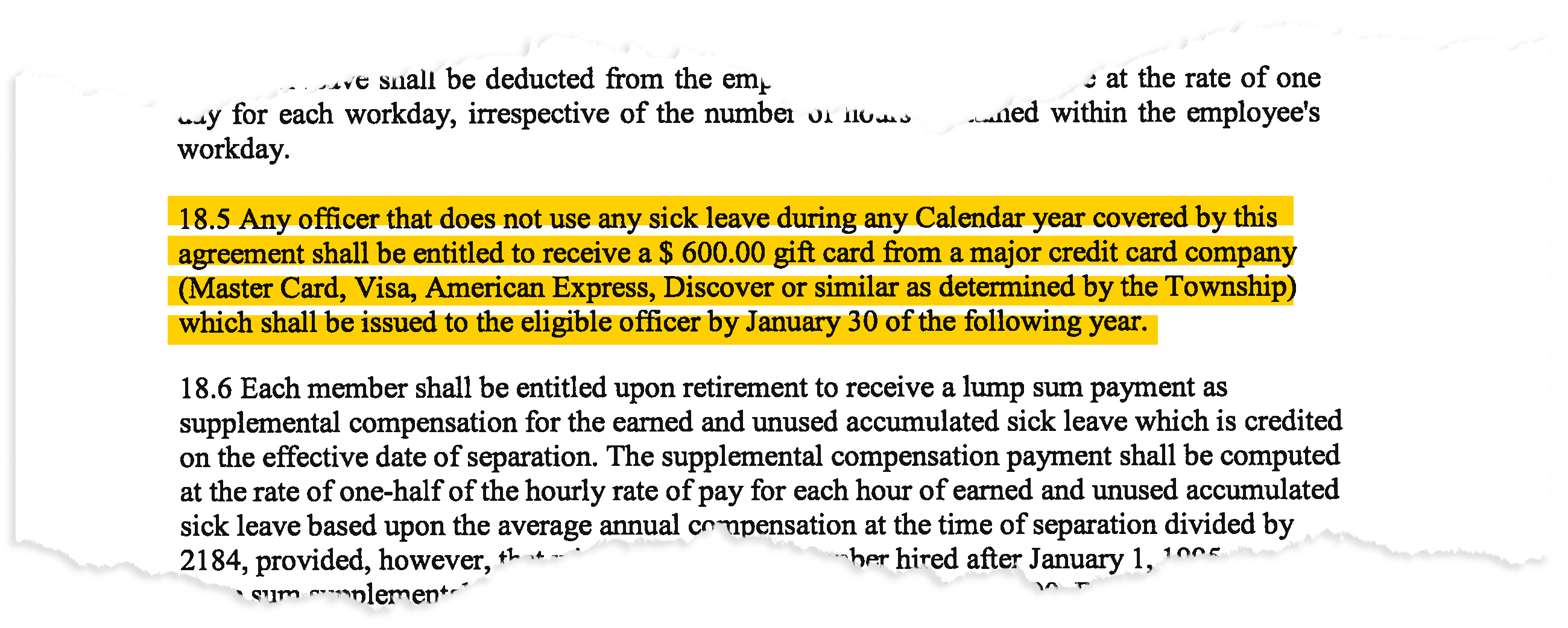 Delanco township’s current contract, effective from July 1, 2019, to June 30, 2022, awards a $600 gift card “from a major credit card company” to any officer who does not use any sick leave during a calendar year.