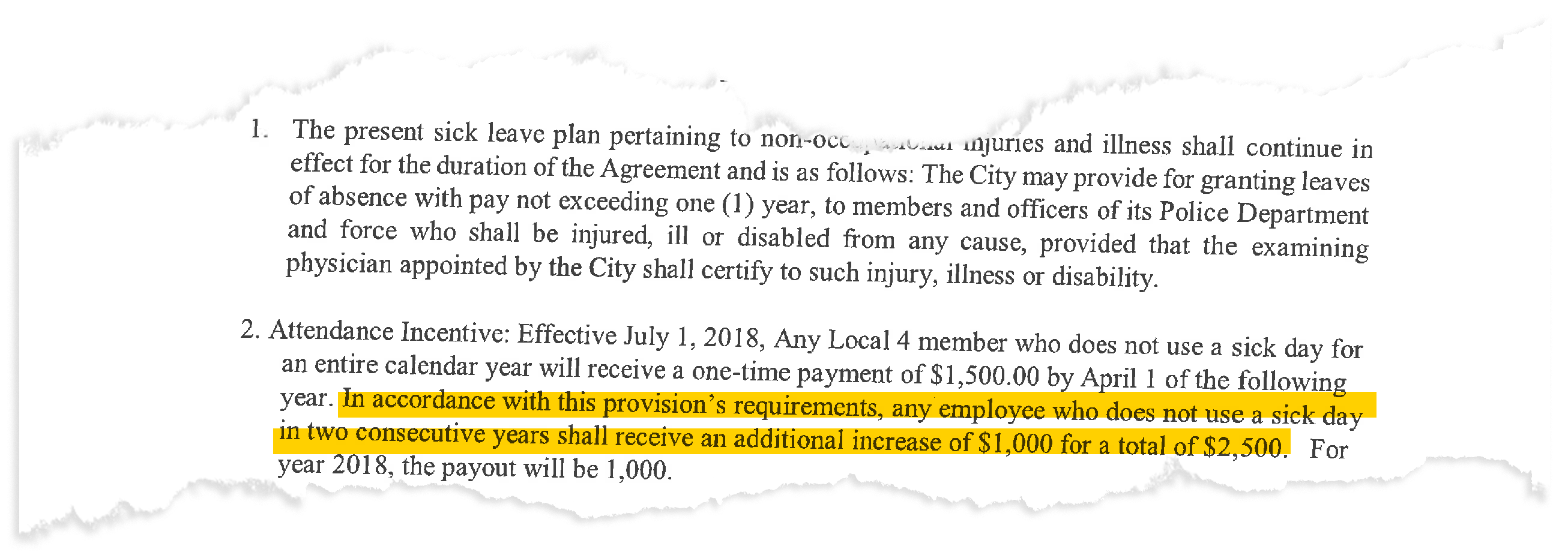 The city of Elizabeth’s current contract, effective from July 1, 2018 to June 30, 2022, awards an annual bonus of $1,500 to any employee who does not use a sick day within a calendar year, and a $2,500 bonus to any employee who does not use a sick day in two consecutive years.