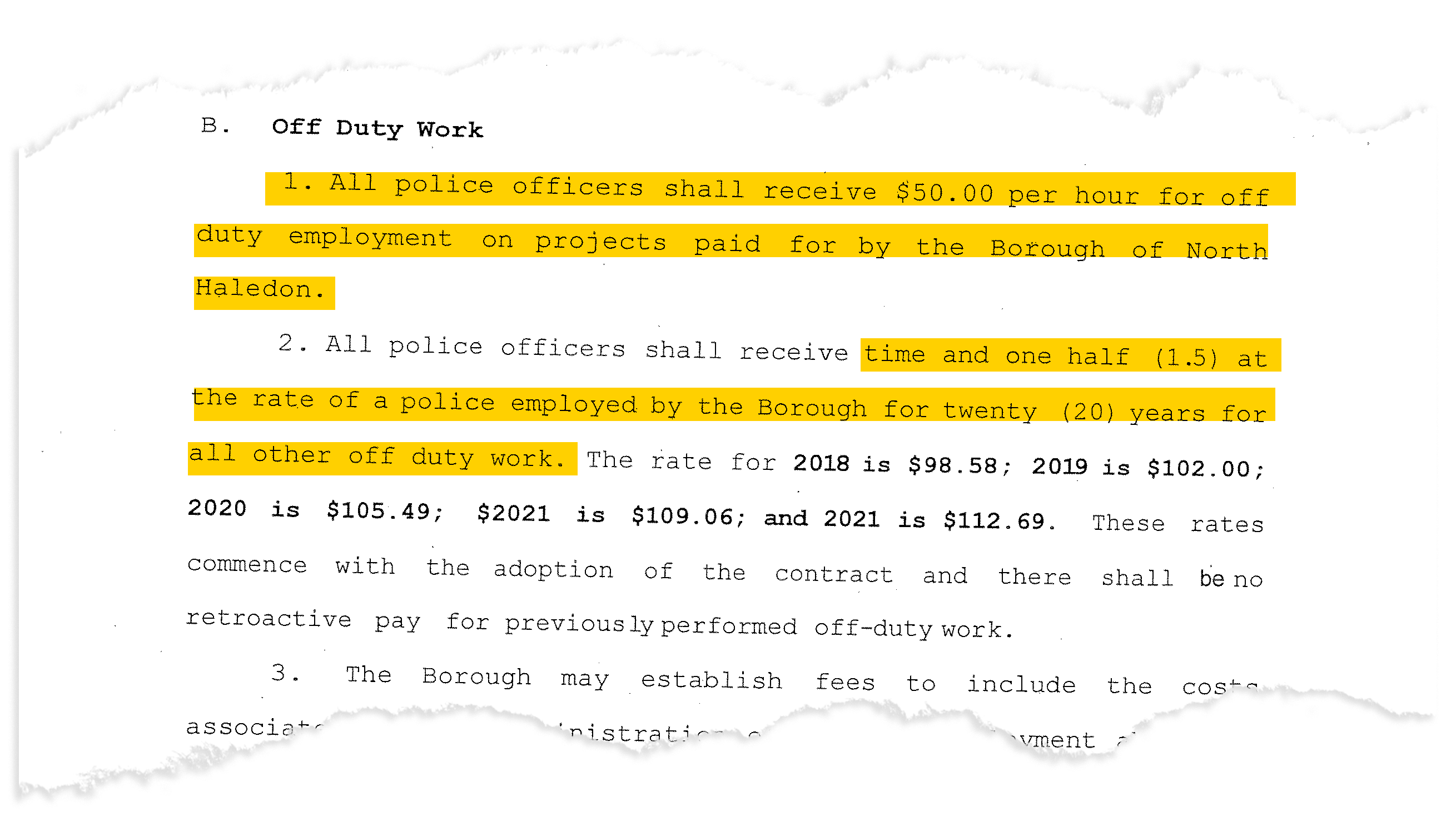 The borough of North Haledon’s current contract, effective from Jan. 1, 2018, to Dec. 31, 2022, guarantees the rate for extra duty to be one and a half times the hourly rate of an officer employed for 20 years, meaning extra duty work pays $112.69 an hour in 2021.