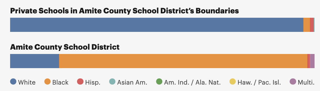 While reporting our project on Segregation Academies in the South last year, we relied on that survey to find private schools founded during desegregation and analyzed their demographics compared to local public school districts. Our analysis of that survey revealed, among other things, Amite County, Mississippi, where about 900 children attend the local public schools — which, as of 2021, were 16% white. By comparison, the two private schools in the county, with more than 600 children, were 96% white.