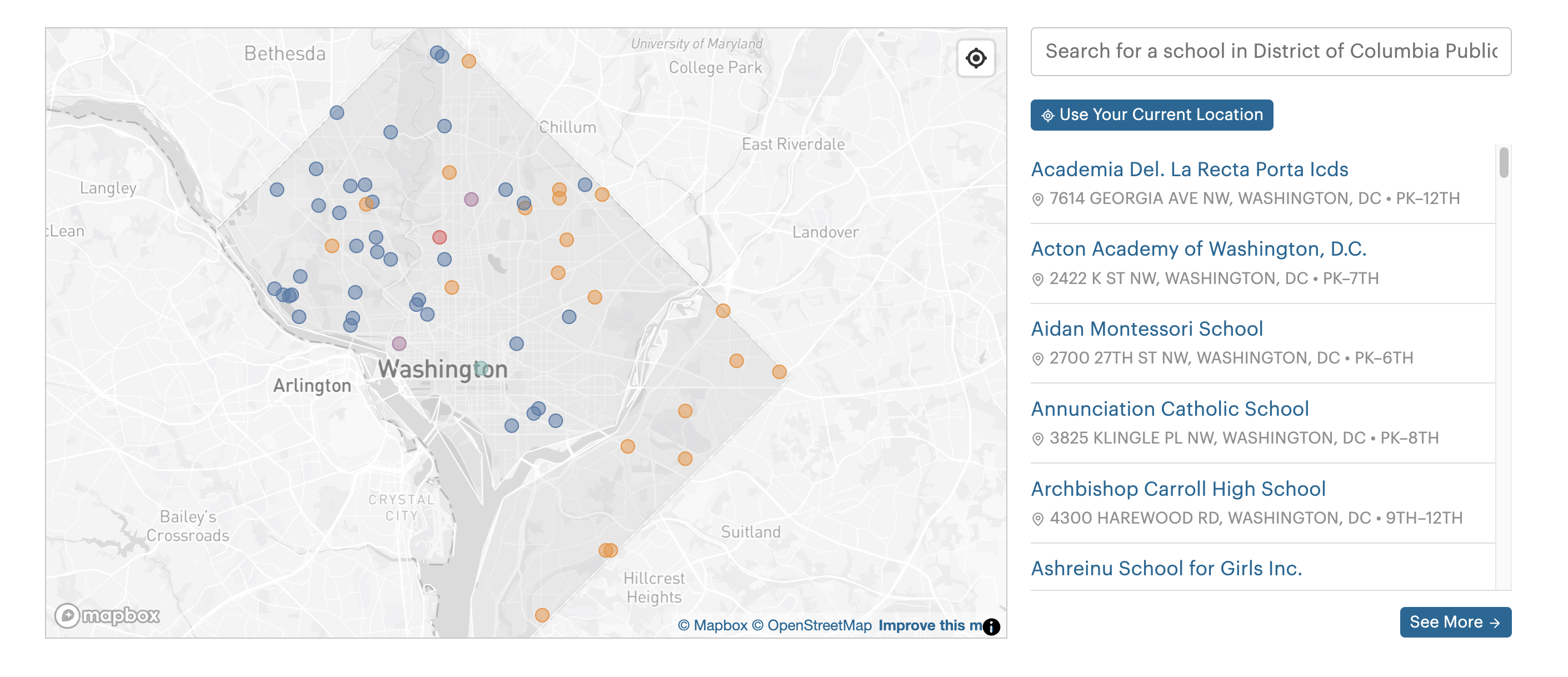 - A searchable map of private schools in the district’s boundaries, color coded by the predominant race of each school’s student body. (Use the lookup tool next to the map to search for schools by name, or click on the “Use Your Current Location” button to zoom in on schools near you. Clicking on a school’s address will fly the map to its location, and clicking on a school’s name will take you to that school’s page.)
