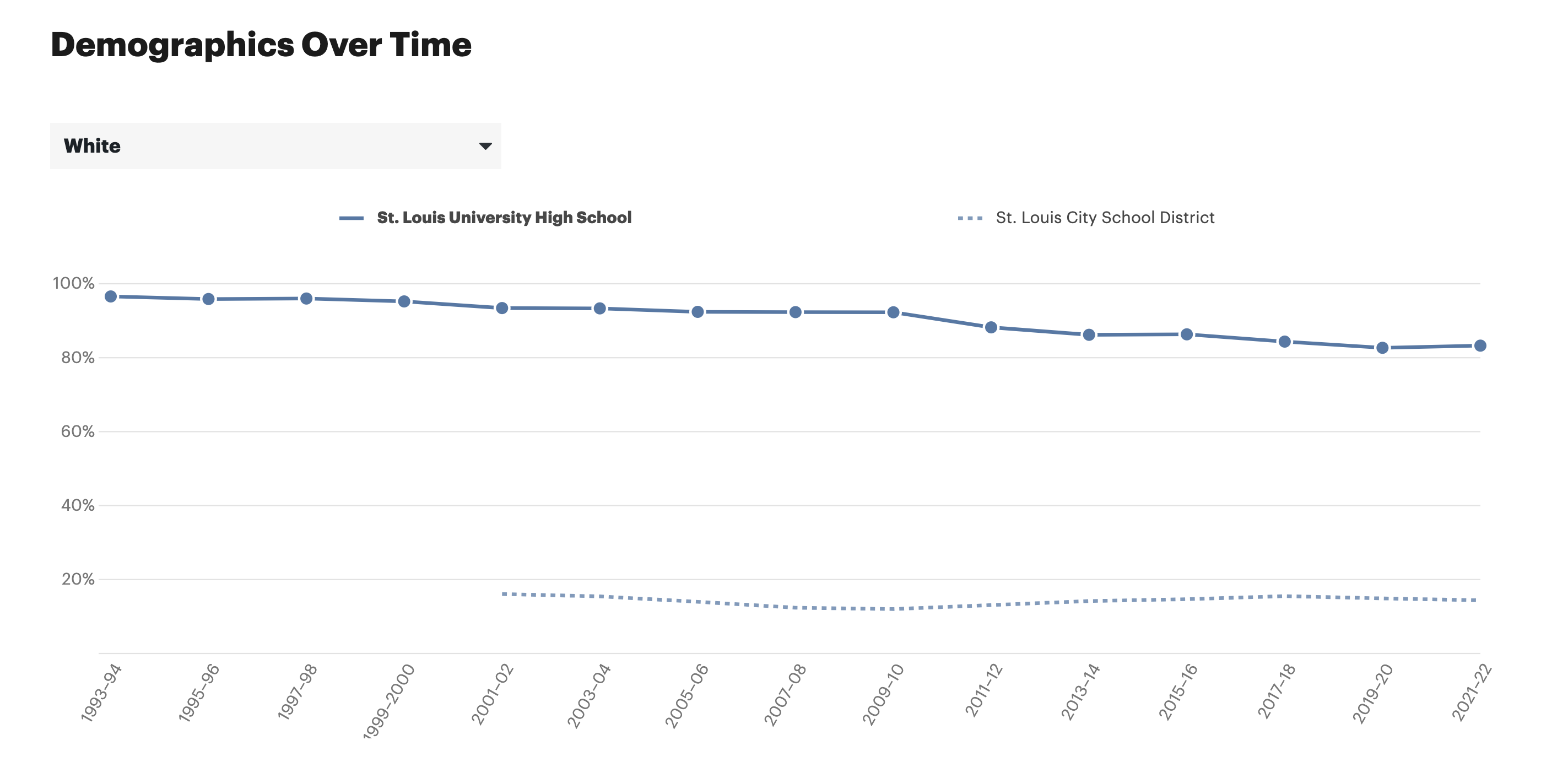 - An interactive line chart that shows how public and private school enrollment have changed over time for each race category. Use the dropdown to change race categories and explore trends for different groups.
